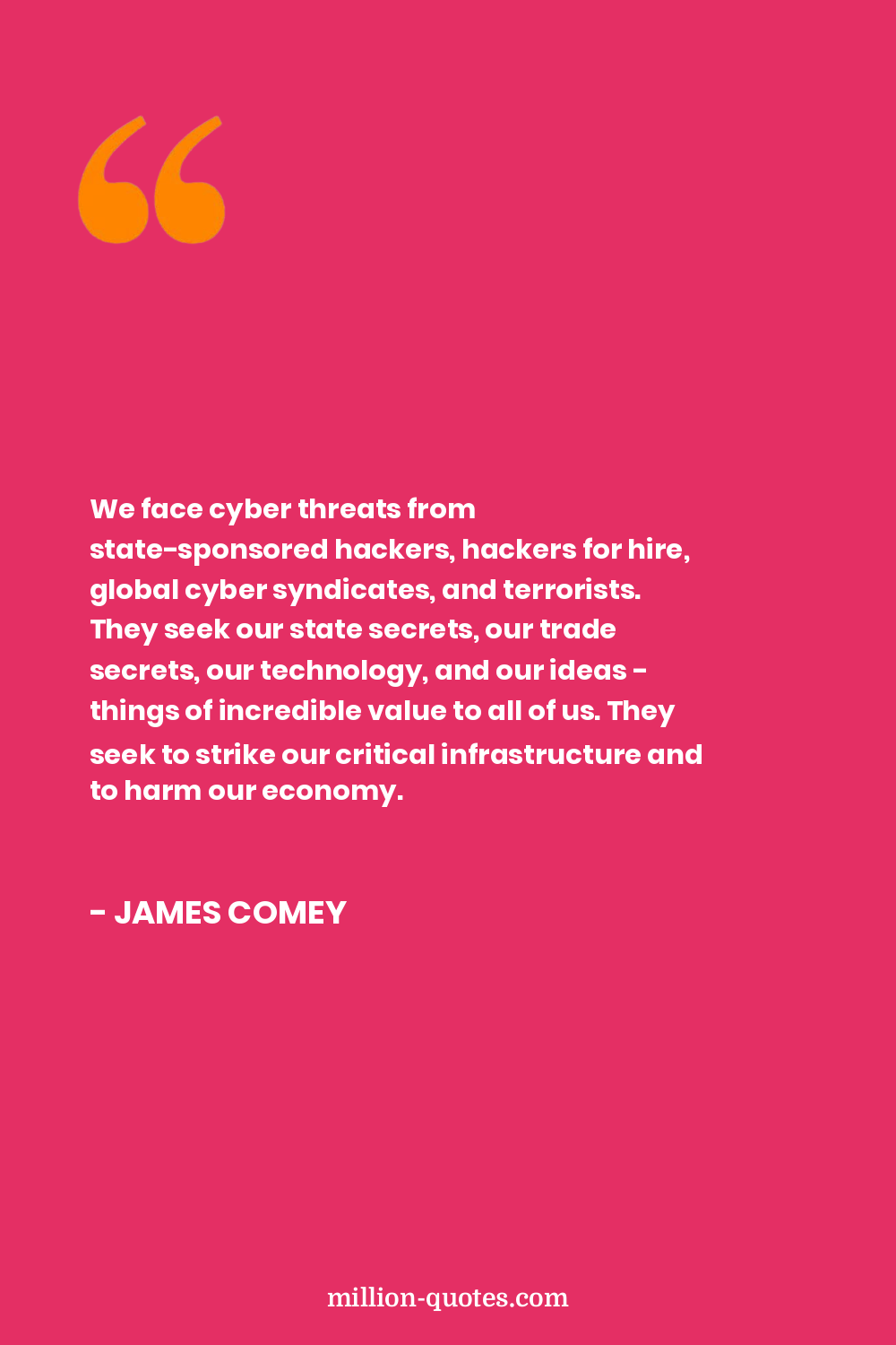 We face cyber threats from state-sponsored hackers, hackers for hire, global cyber syndicates, and terrorists. They seek our state secrets, our trade secrets, our technology, and our ideas - things of incredible value to all of us. They seek to strike our critical infrastructure and to harm our economy.