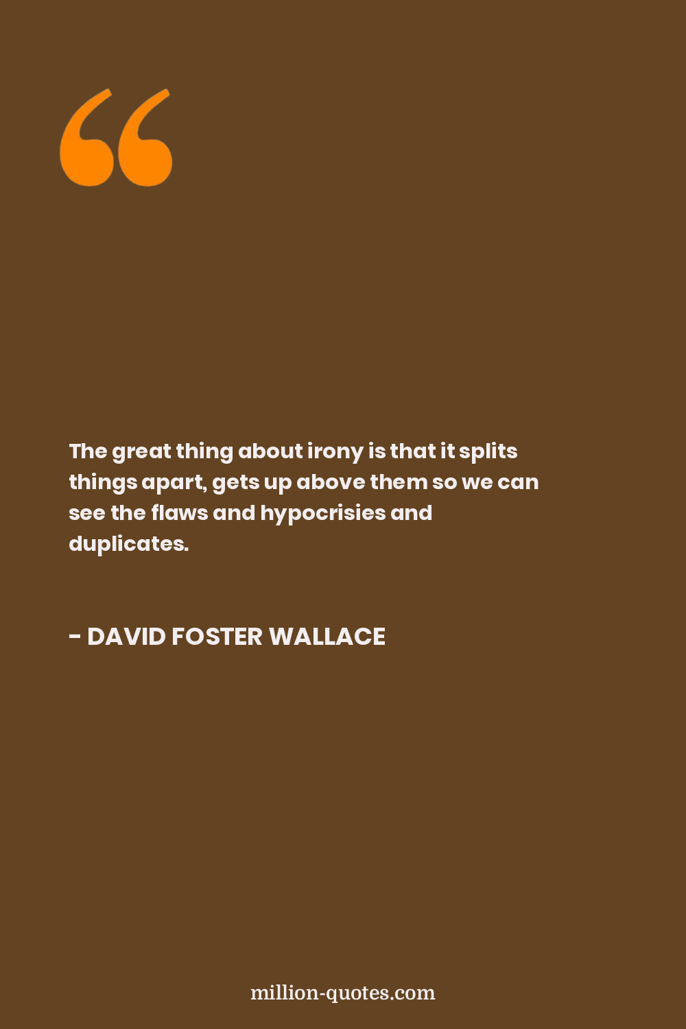 The great thing about irony is that it splits things apart, gets up above them so we can see the flaws and hypocrisies and duplicates.