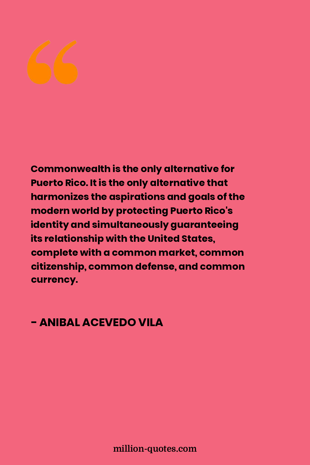 Commonwealth is the only alternative for Puerto Rico. It is the only alternative that harmonizes the aspirations and goals of the modern world by protecting Puerto Rico's identity and simultaneously guaranteeing its relationship with the United States, complete with a common market, common citizenship, common defense, and common currency.
