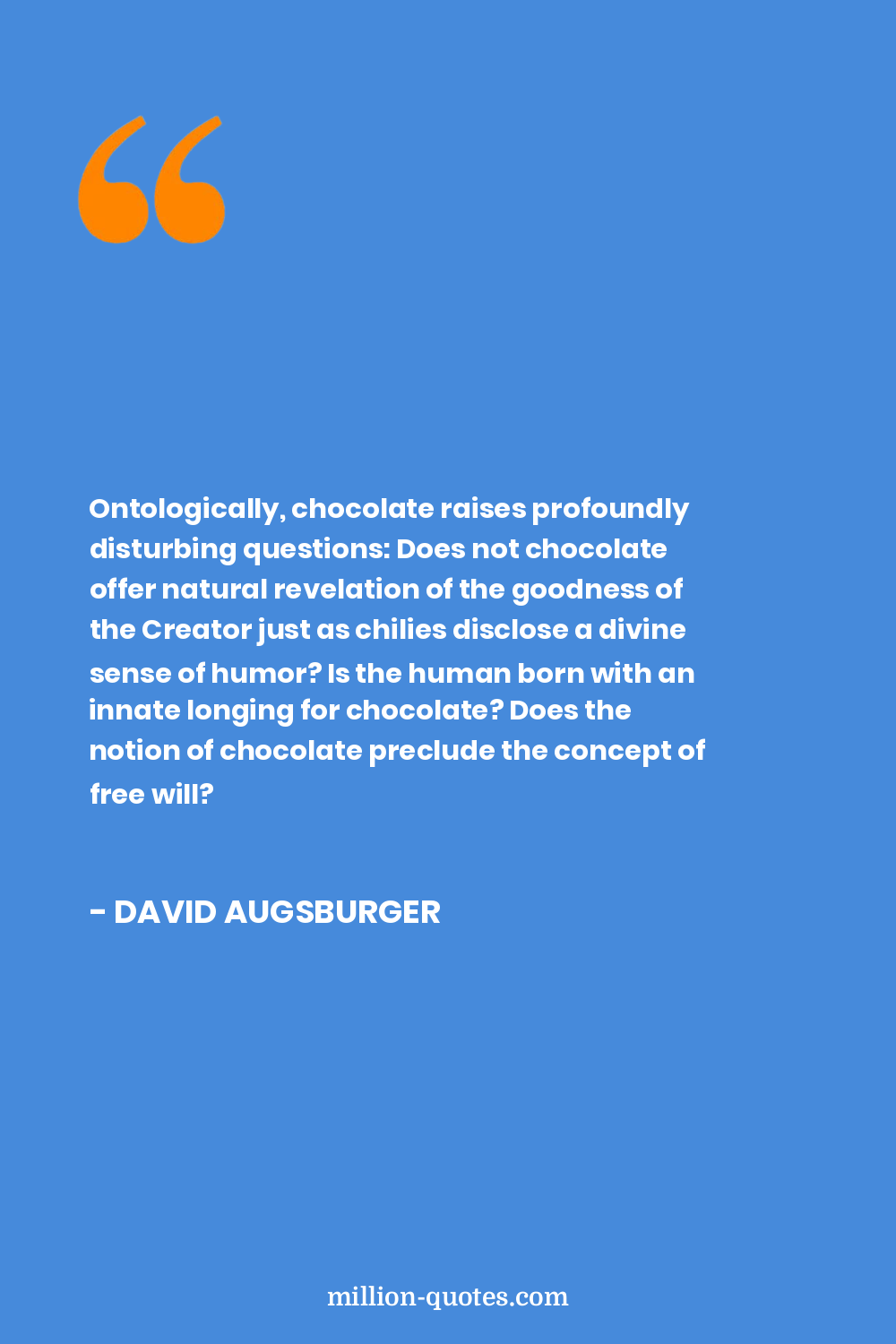 Ontologically, chocolate raises profoundly disturbing questions: Does not chocolate offer natural revelation of the goodness of the Creator just as chilies disclose a divine sense of humor? Is the human born with an innate longing for chocolate? Does the notion of chocolate preclude the concept of free will?