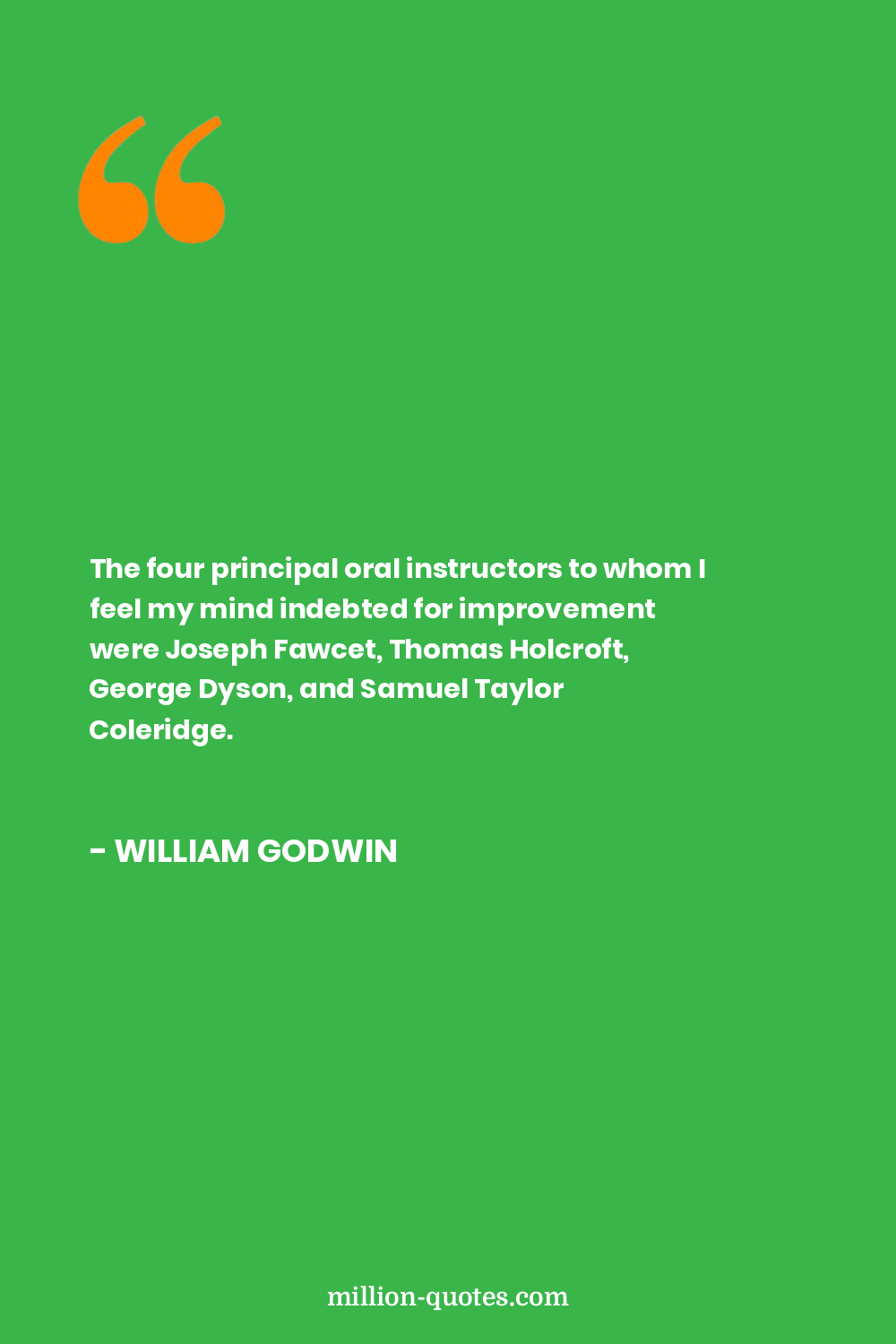 The four principal oral instructors to whom I feel my mind indebted for improvement were Joseph Fawcet, Thomas Holcroft, George Dyson, and Samuel Taylor Coleridge.