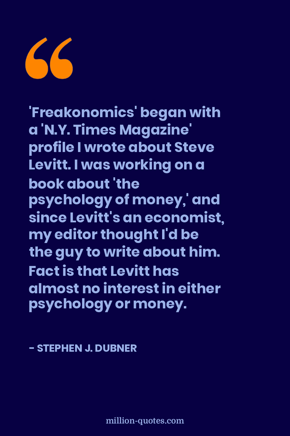 'Freakonomics' began with a 'N.Y. Times Magazine' profile I wrote about Steve Levitt. I was working on a book about 'the psychology of money,' and since Levitt's an economist, my editor thought I'd be the guy to write about him. Fact is that Levitt has almost no interest in either psychology or money.