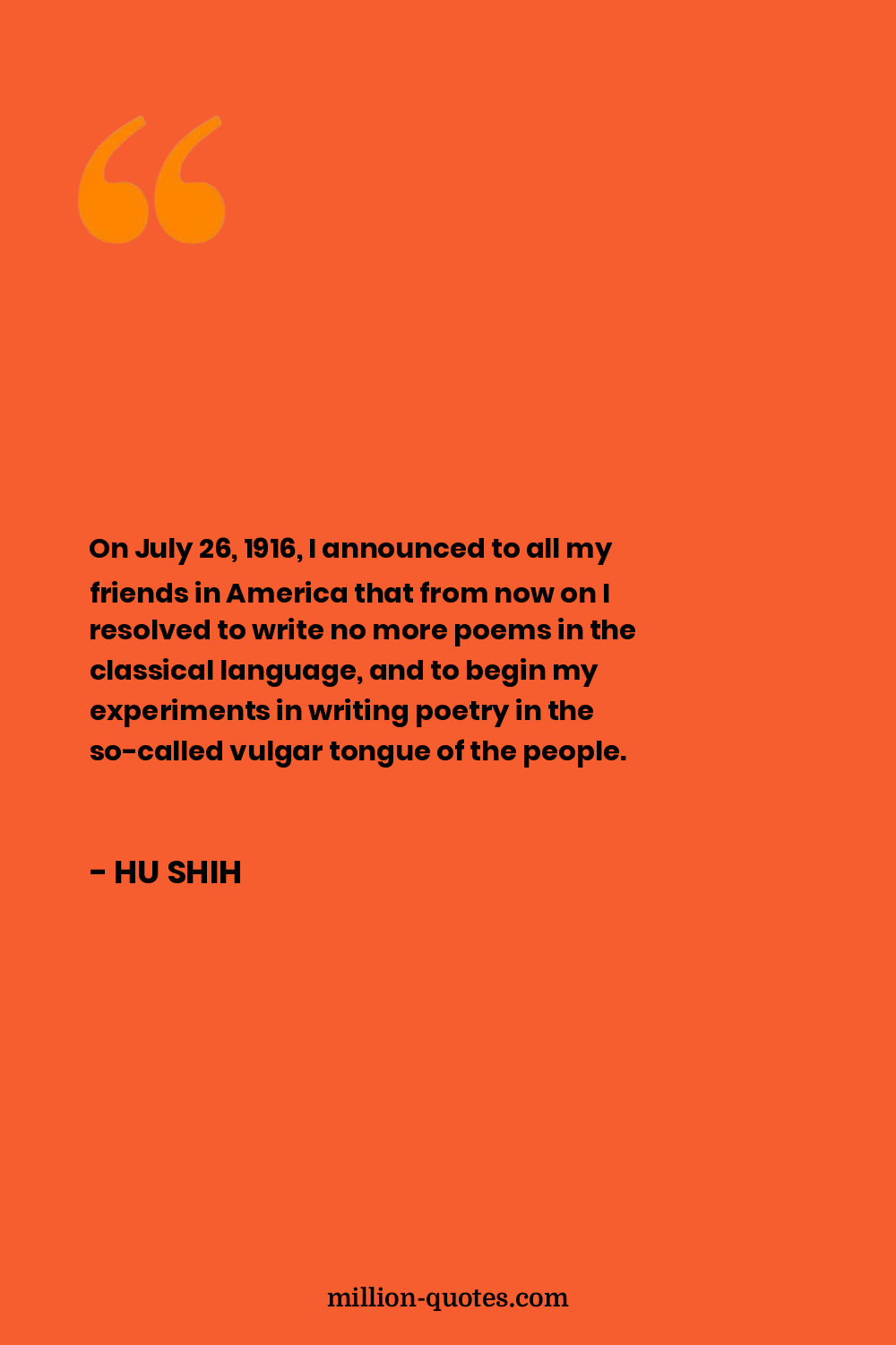 On July 26, 1916, I announced to all my friends in America that from now on I resolved to write no more poems in the classical language, and to begin my experiments in writing poetry in the so-called vulgar tongue of the people.
