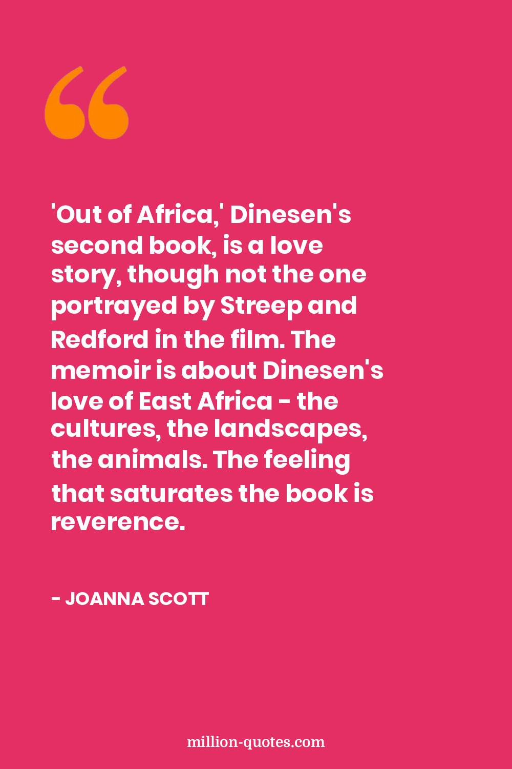 'Out of Africa,' Dinesen's second book, is a love story, though not the one portrayed by Streep and Redford in the film. The memoir is about Dinesen's love of East Africa - the cultures, the landscapes, the animals. The feeling that saturates the book is reverence.