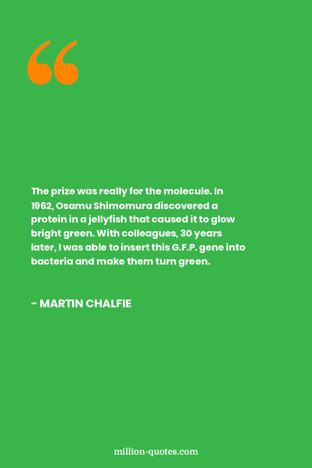 The prize was really for the molecule. In 1962, Osamu Shimomura discovered a protein in a jellyfish that caused it to glow bright green. With colleagues, 30 years later, I was able to insert this G.F.P. gene into bacteria and make them turn green.