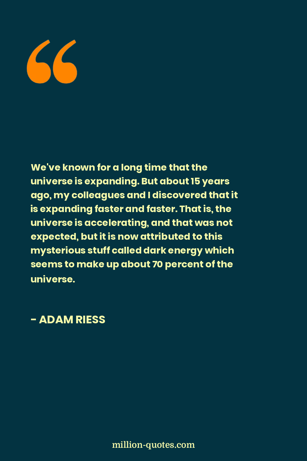 We've known for a long time that the universe is expanding. But about 15 years ago, my colleagues and I discovered that it is expanding faster and faster. That is, the universe is accelerating, and that was not expected, but it is now attributed to this mysterious stuff called dark energy which seems to make up about 70 percent of the universe.