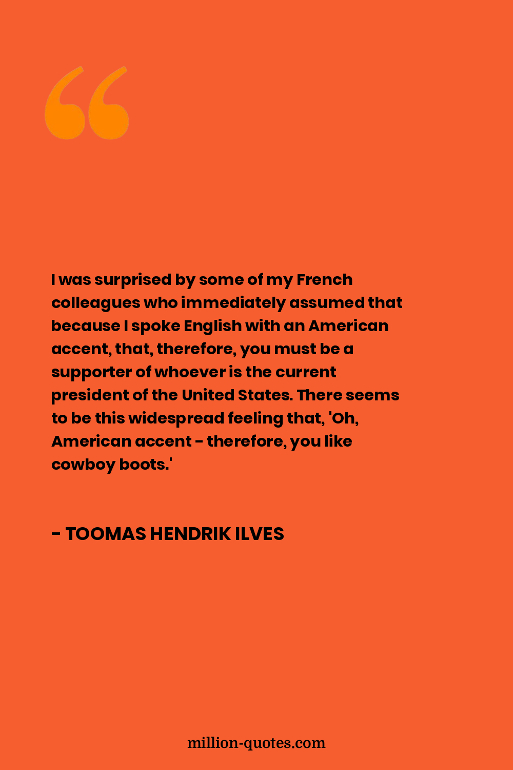 I was surprised by some of my French colleagues who immediately assumed that because I spoke English with an American accent, that, therefore, you must be a supporter of whoever is the current president of the United States. There seems to be this widespread feeling that, 'Oh, American accent - therefore, you like cowboy boots.'