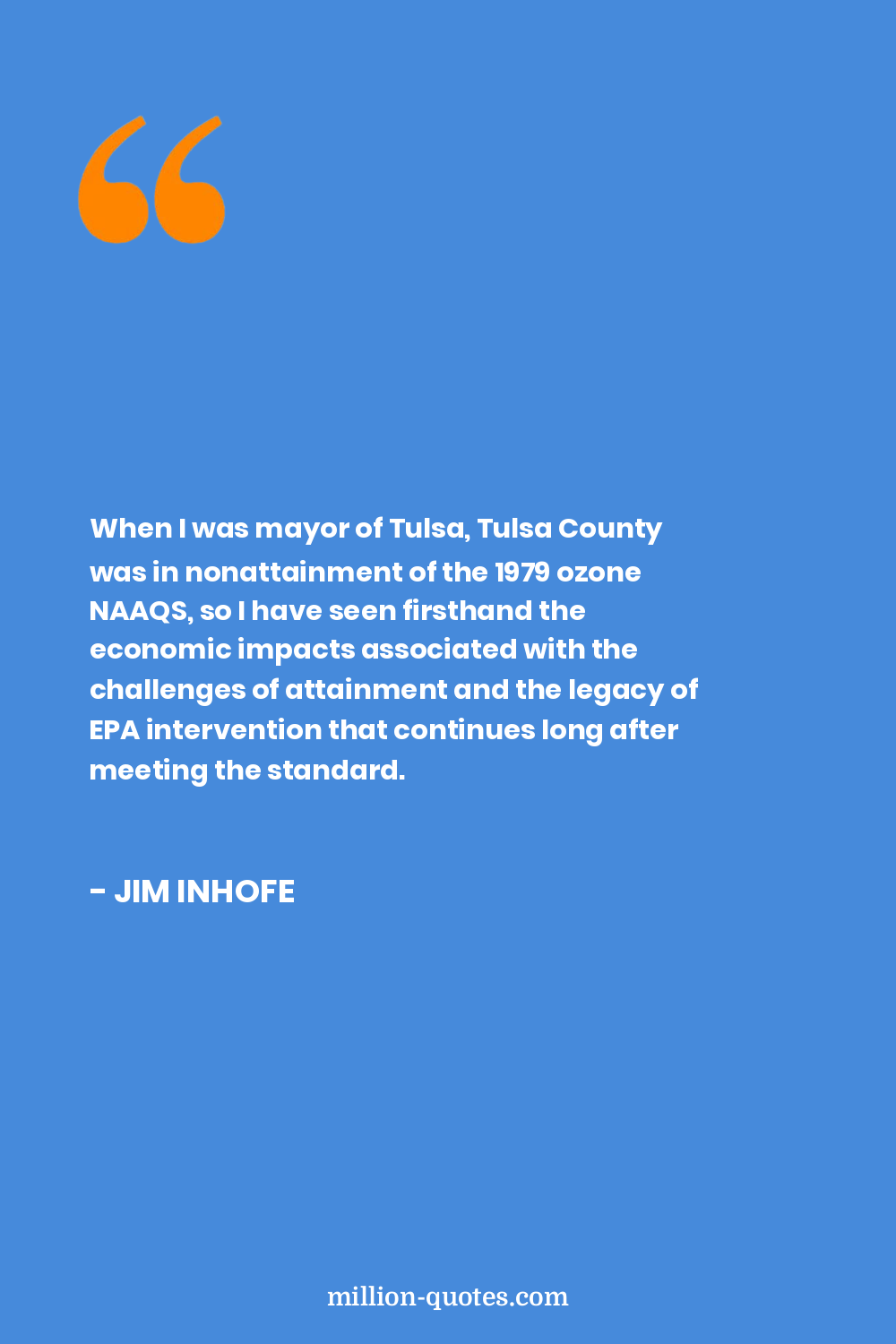 When I was mayor of Tulsa, Tulsa County was in nonattainment of the 1979 ozone NAAQS, so I have seen firsthand the economic impacts associated with the challenges of attainment and the legacy of EPA intervention that continues long after meeting the standard.