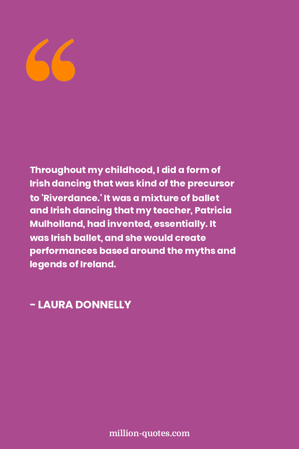 Throughout my childhood, I did a form of Irish dancing that was kind of the precursor to 'Riverdance.' It was a mixture of ballet and Irish dancing that my teacher, Patricia Mulholland, had invented, essentially. It was Irish ballet, and she would create performances based around the myths and legends of Ireland.