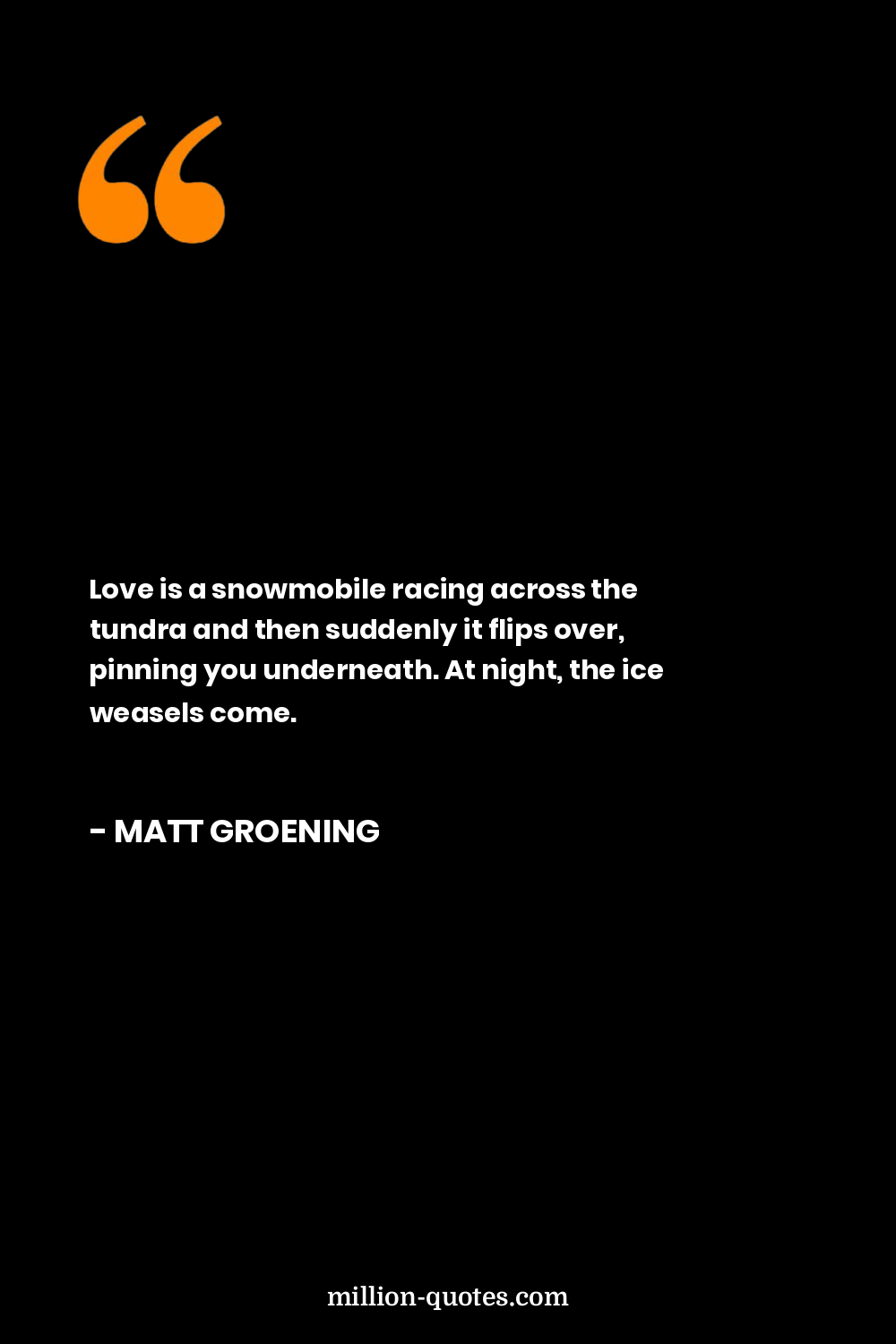 Love is a snowmobile racing across the tundra and then suddenly it flips over, pinning you underneath. At night, the ice weasels come.