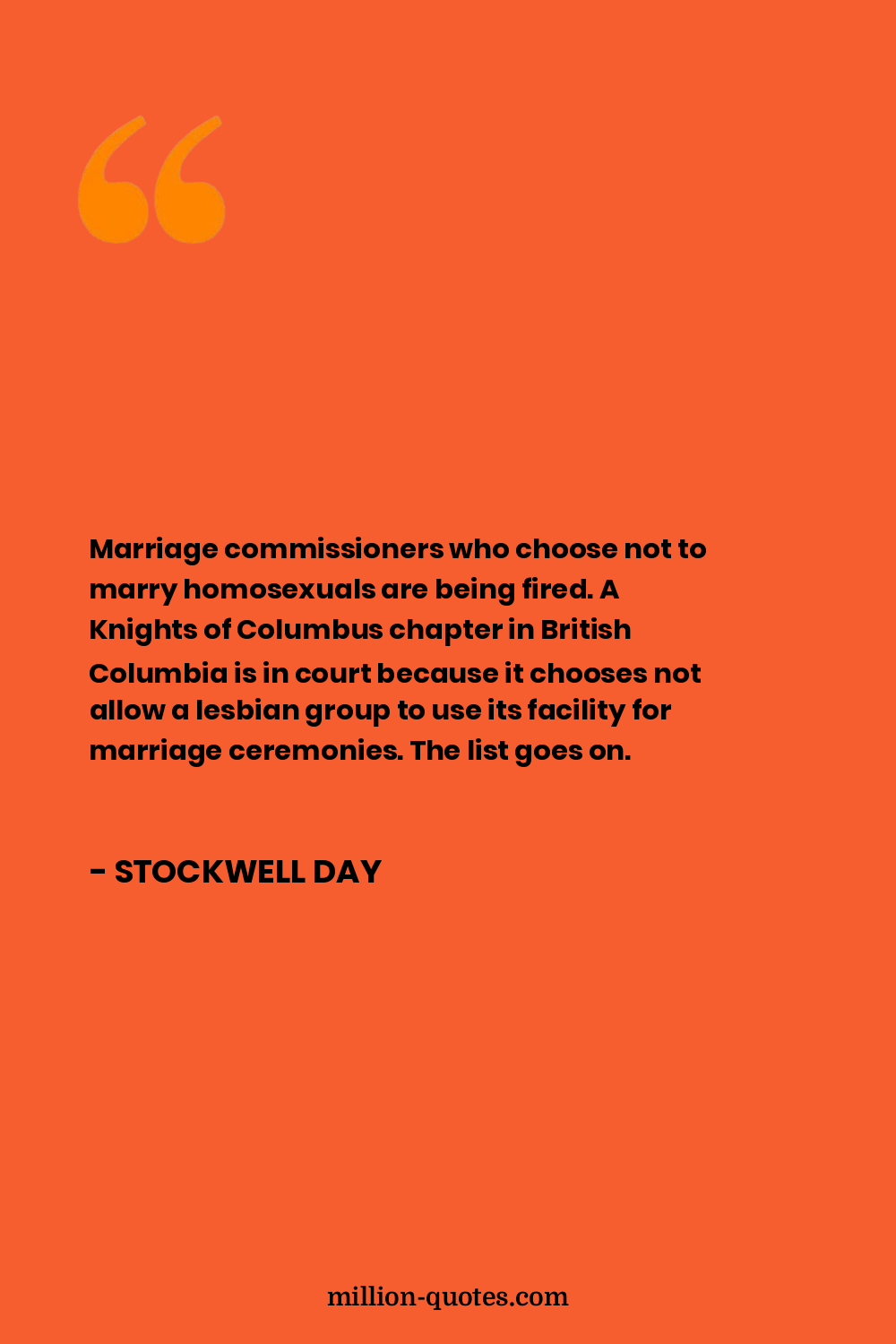 Marriage commissioners who choose not to marry homosexuals are being fired. A Knights of Columbus chapter in British Columbia is in court because it chooses not allow a lesbian group to use its facility for marriage ceremonies. The list goes on.