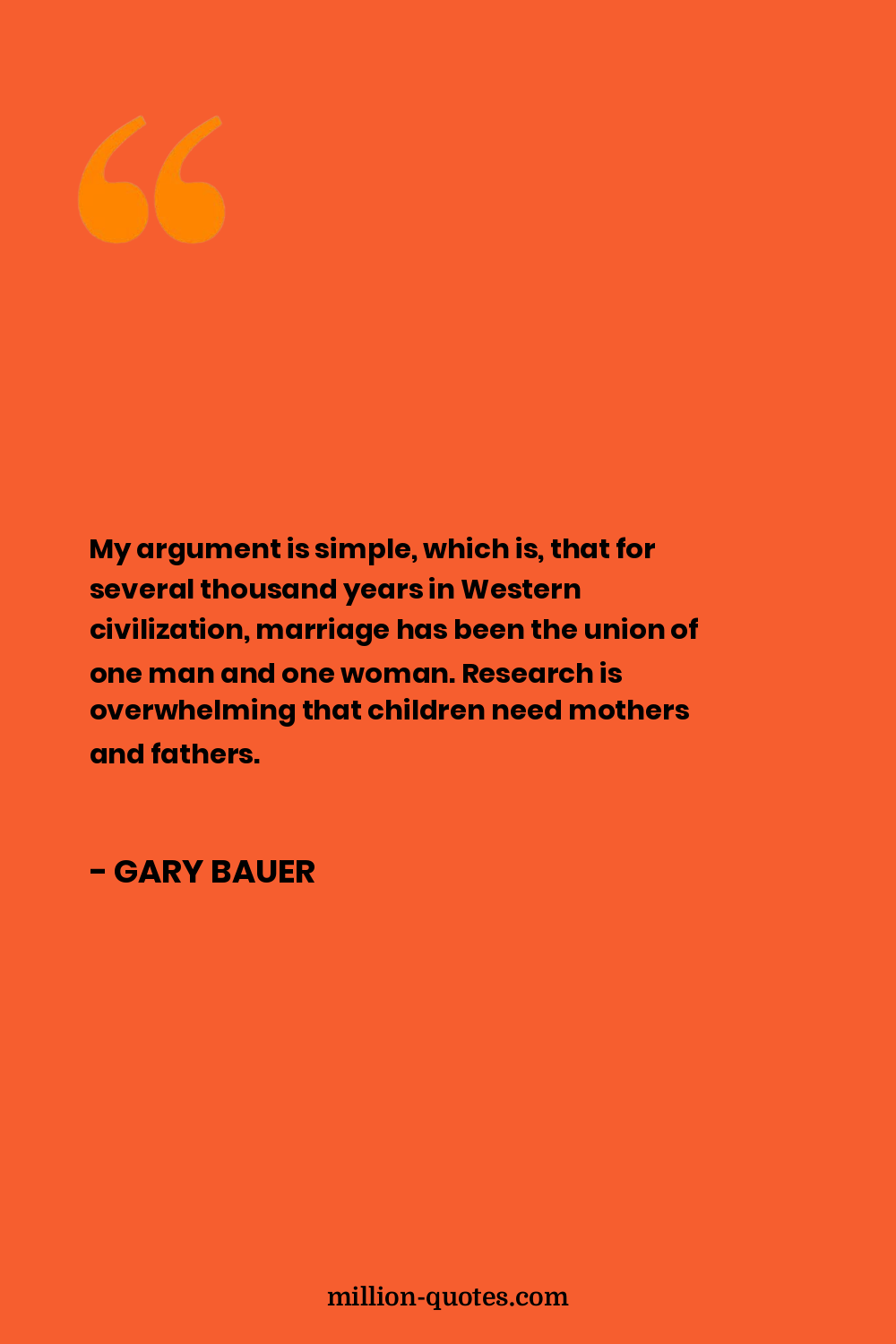 My argument is simple, which is, that for several thousand years in Western civilization, marriage has been the union of one man and one woman. Research is overwhelming that children need mothers and fathers.