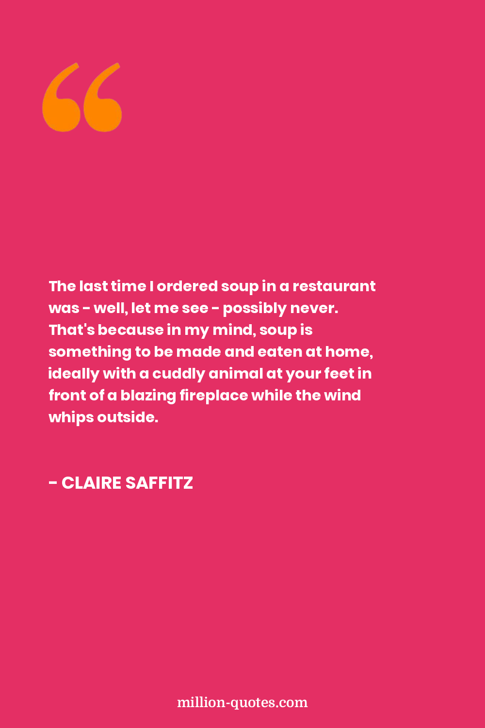 The last time I ordered soup in a restaurant was - well, let me see - possibly never. That's because in my mind, soup is something to be made and eaten at home, ideally with a cuddly animal at your feet in front of a blazing fireplace while the wind whips outside.