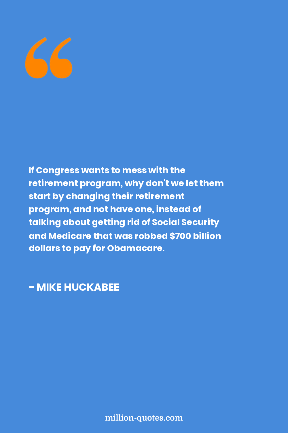 If Congress wants to mess with the retirement program, why don't we let them start by changing their retirement program, and not have one, instead of talking about getting rid of Social Security and Medicare that was robbed $700 billion dollars to pay for Obamacare.