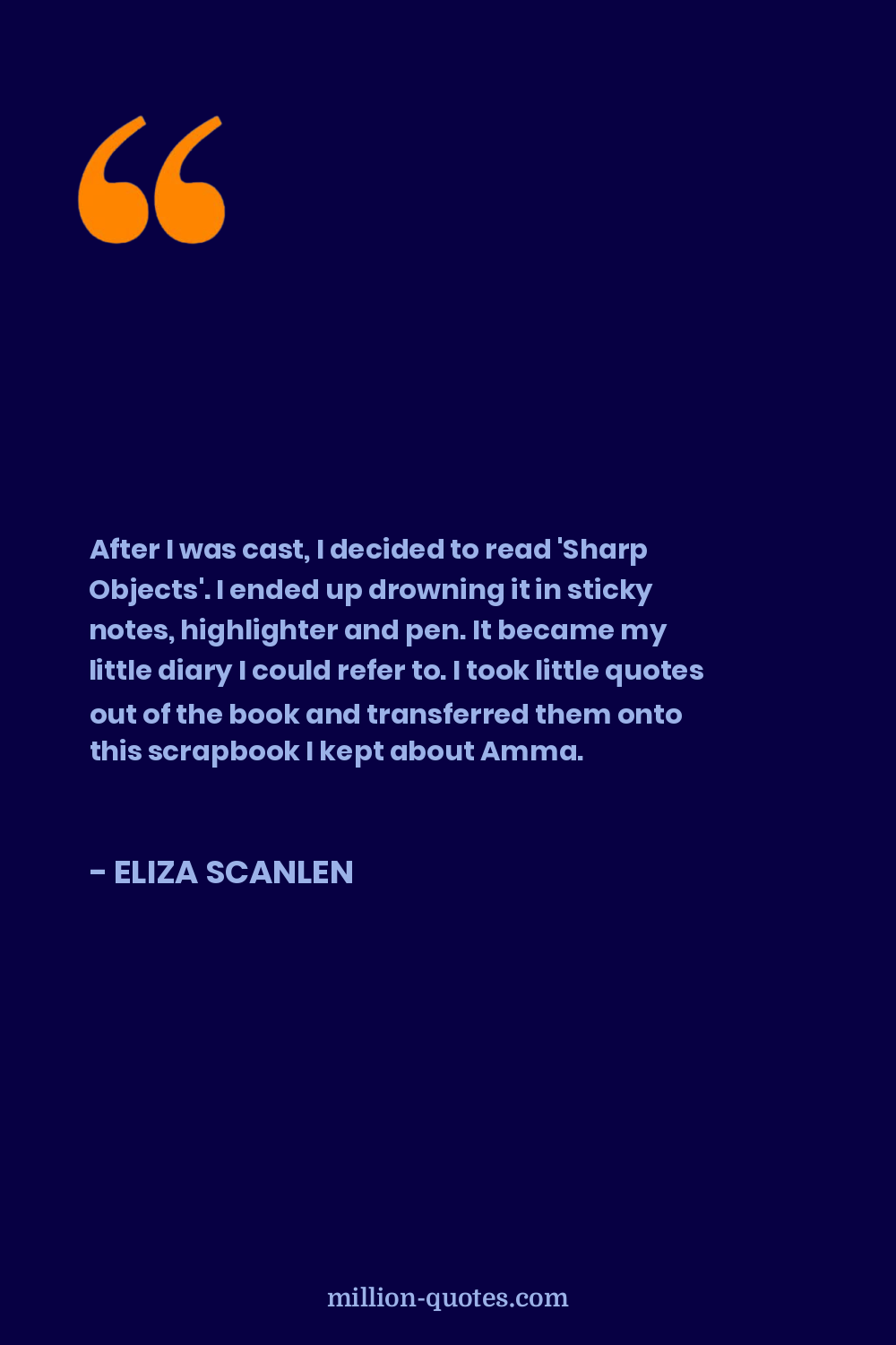 After I was cast, I decided to read 'Sharp Objects'. I ended up drowning it in sticky notes, highlighter and pen. It became my little diary I could refer to. I took little quotes out of the book and transferred them onto this scrapbook I kept about Amma.