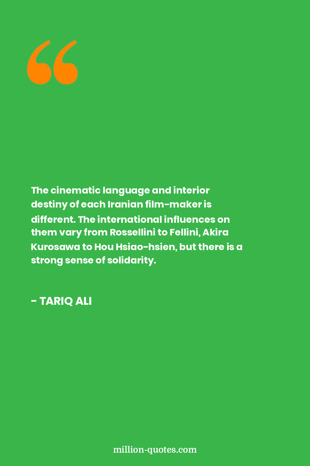 The cinematic language and interior destiny of each Iranian film-maker is different. The international influences on them vary from Rossellini to Fellini, Akira Kurosawa to Hou Hsiao-hsien, but there is a strong sense of solidarity.