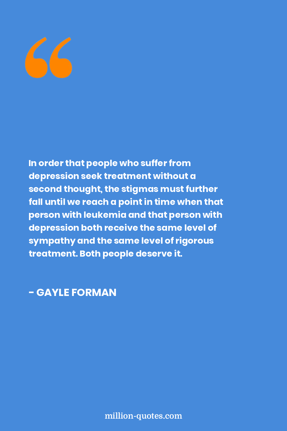 In order that people who suffer from depression seek treatment without a second thought, the stigmas must further fall until we reach a point in time when that person with leukemia and that person with depression both receive the same level of sympathy and the same level of rigorous treatment. Both people deserve it.