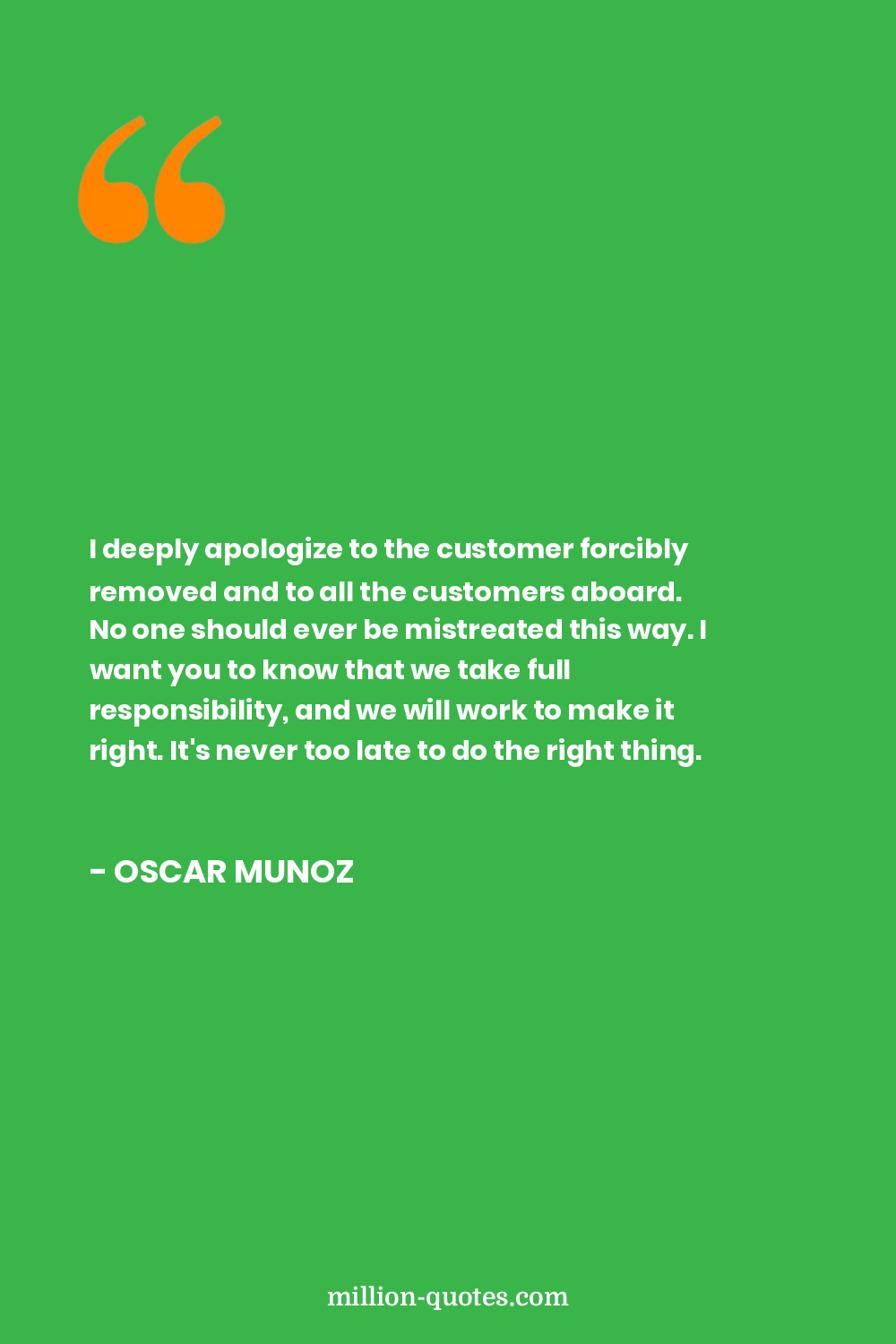 I deeply apologize to the customer forcibly removed and to all the customers aboard. No one should ever be mistreated this way. I want you to know that we take full responsibility, and we will work to make it right. It's never too late to do the right thing.