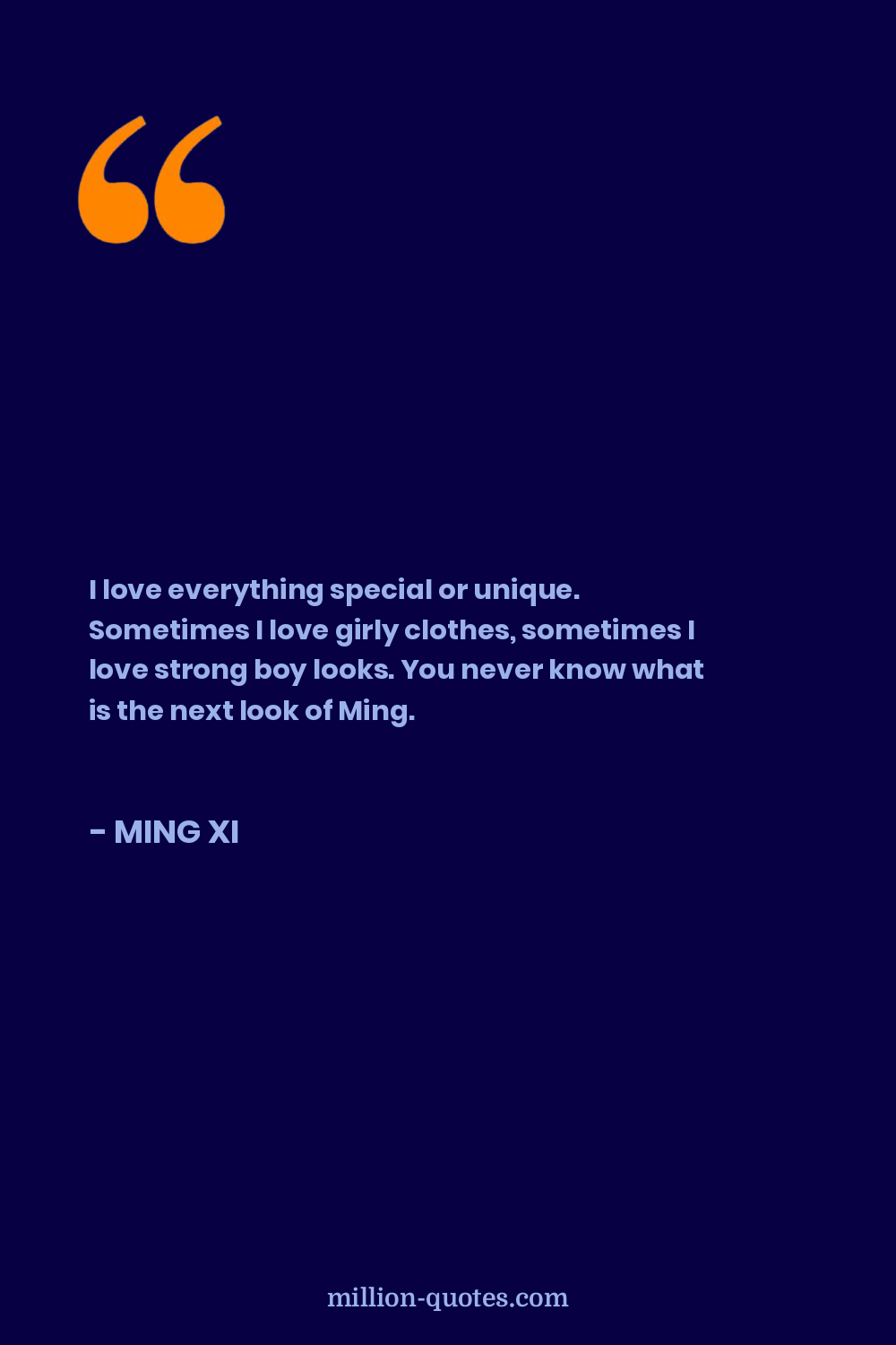 I love everything special or unique. Sometimes I love girly clothes, sometimes I love strong boy looks. You never know what is the next look of Ming.
