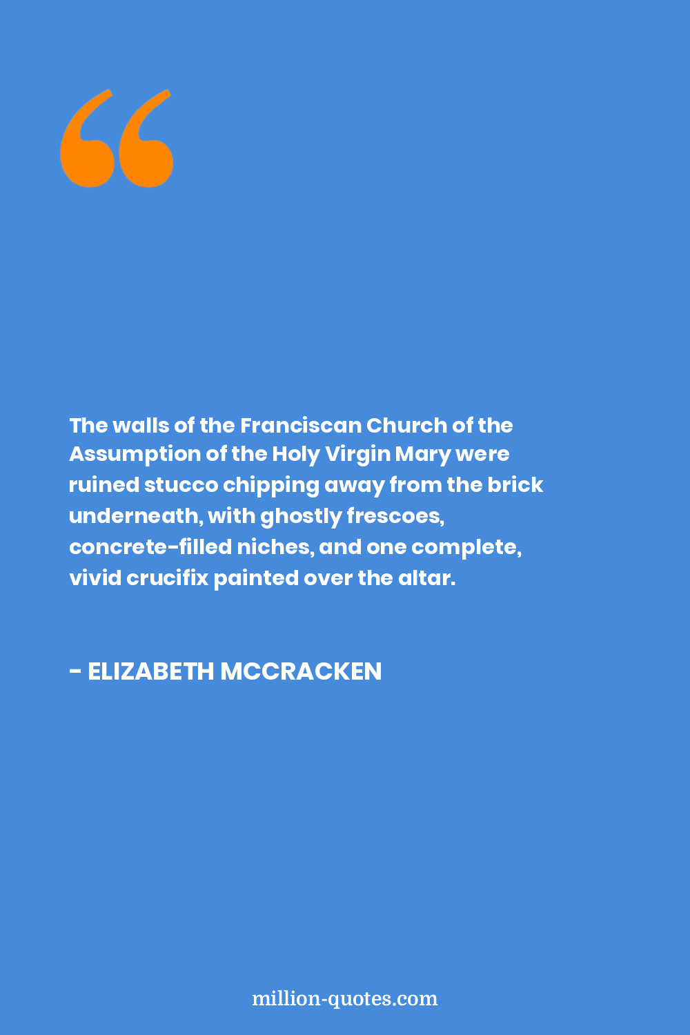 The walls of the Franciscan Church of the Assumption of the Holy Virgin Mary were ruined stucco chipping away from the brick underneath, with ghostly frescoes, concrete-filled niches, and one complete, vivid crucifix painted over the altar.