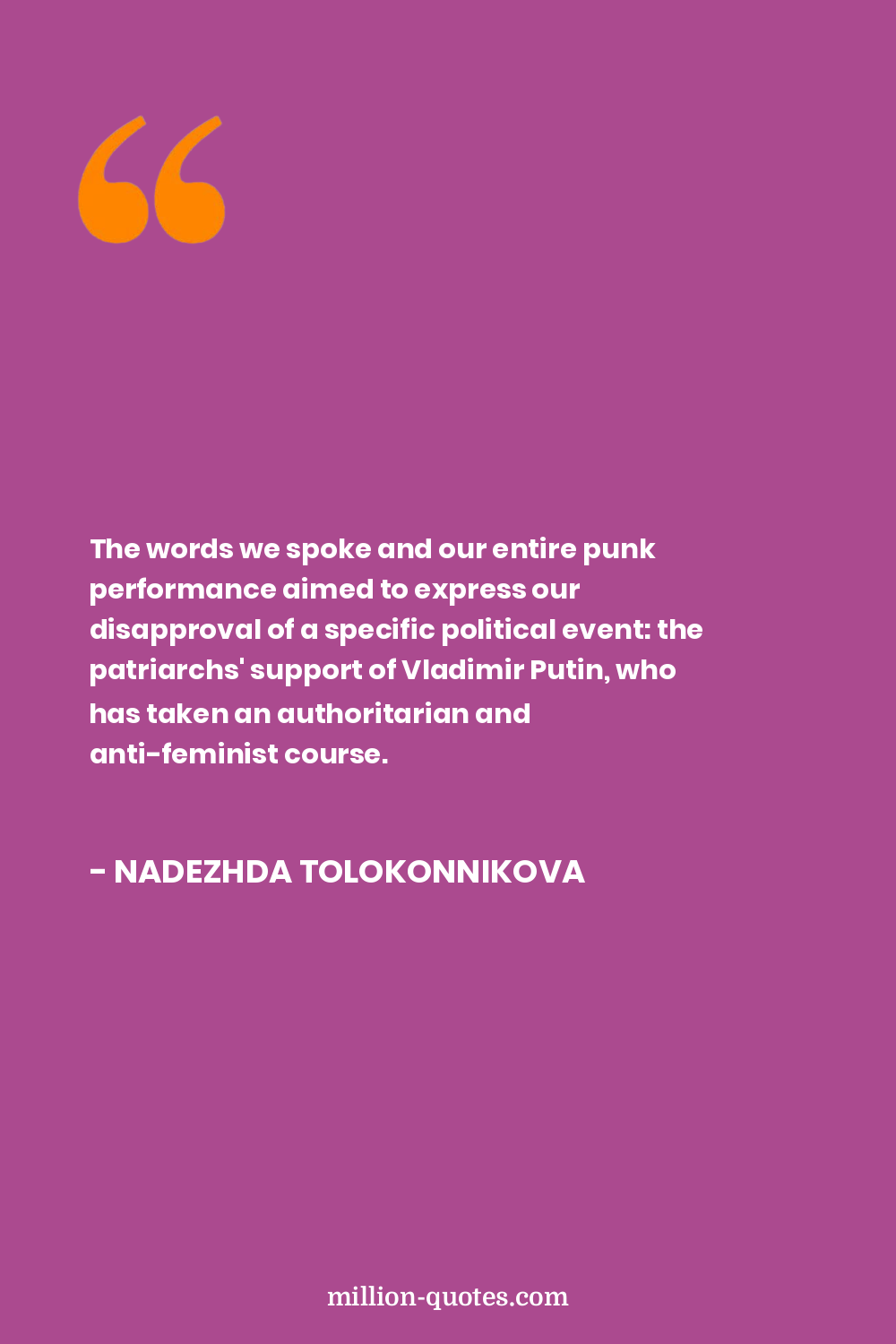 The words we spoke and our entire punk performance aimed to express our disapproval of a specific political event: the patriarchs' support of Vladimir Putin, who has taken an authoritarian and anti-feminist course.